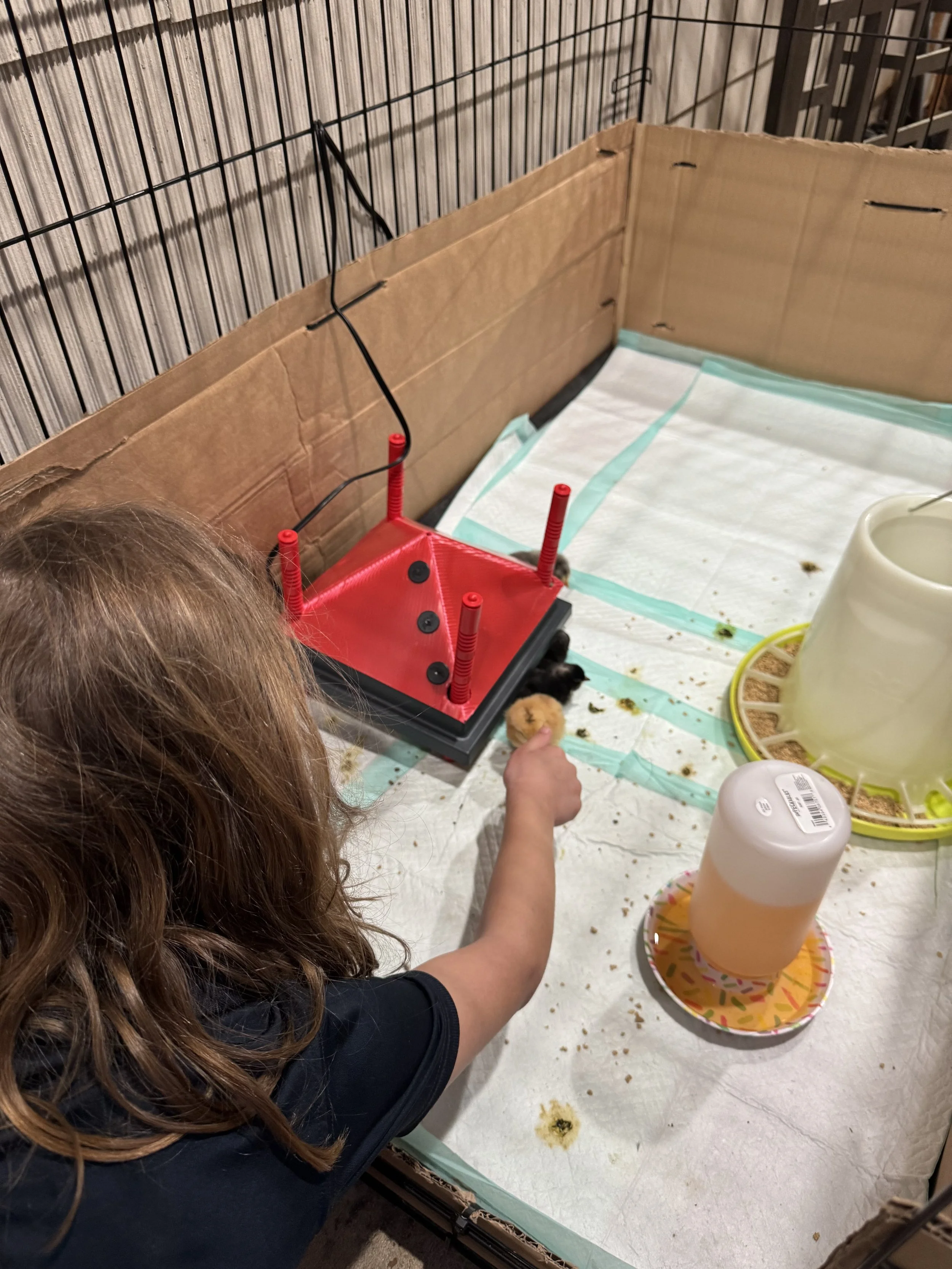 THAT’S IT. It’s so stupidly easy—and it works. We used puppy pads for the first few days/weeks for ease of cleaning. Once the birds got bigger, we added pine shavings (because they’re cheaper than hemp). This is where it was super beneficial to have left the tray in the bottom able to slide. Your brooder plate size will be based on how many chicks you have—so be sure to research that. For reference, the 12x12 is good for 20 chicks. For enrichment, we added some roosts made of natural sticks that we nailed together and made a dust bath out of a shallow dish. Use all-purpose sand, never ever ever ever play sand.
